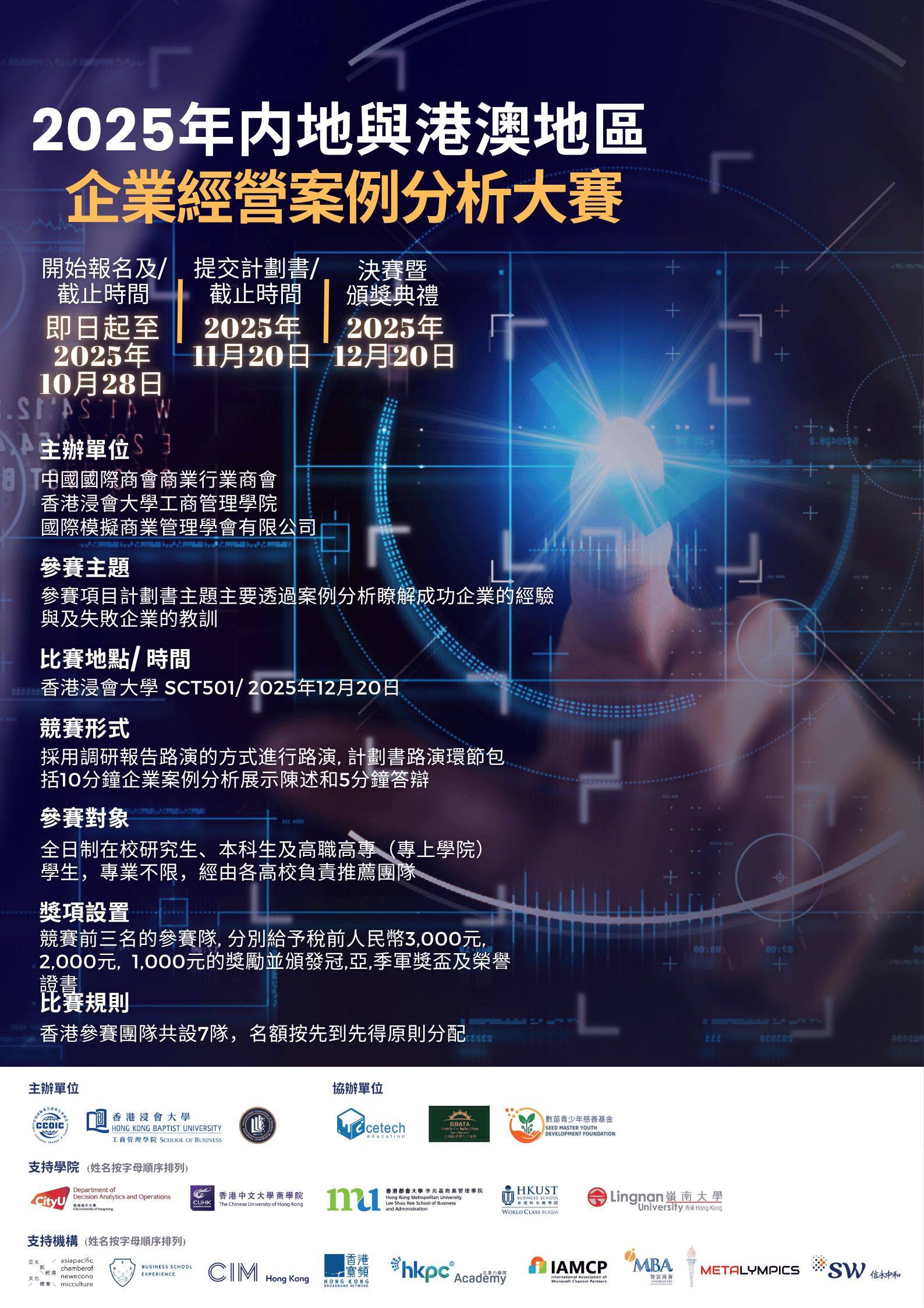 I am pleased to announce that the China Mainland, Hong Kong and Macao Enterprise Business Case Analysis Competition 2025 will be held on Dec 20 2025. This event aims to promote educational exchanges between higher education institutions across the two regions, enhance students' strategic planning, industry analysis, and communication skills, and provide a platform to showcase talents, strengthen professional skills, and support future career development.